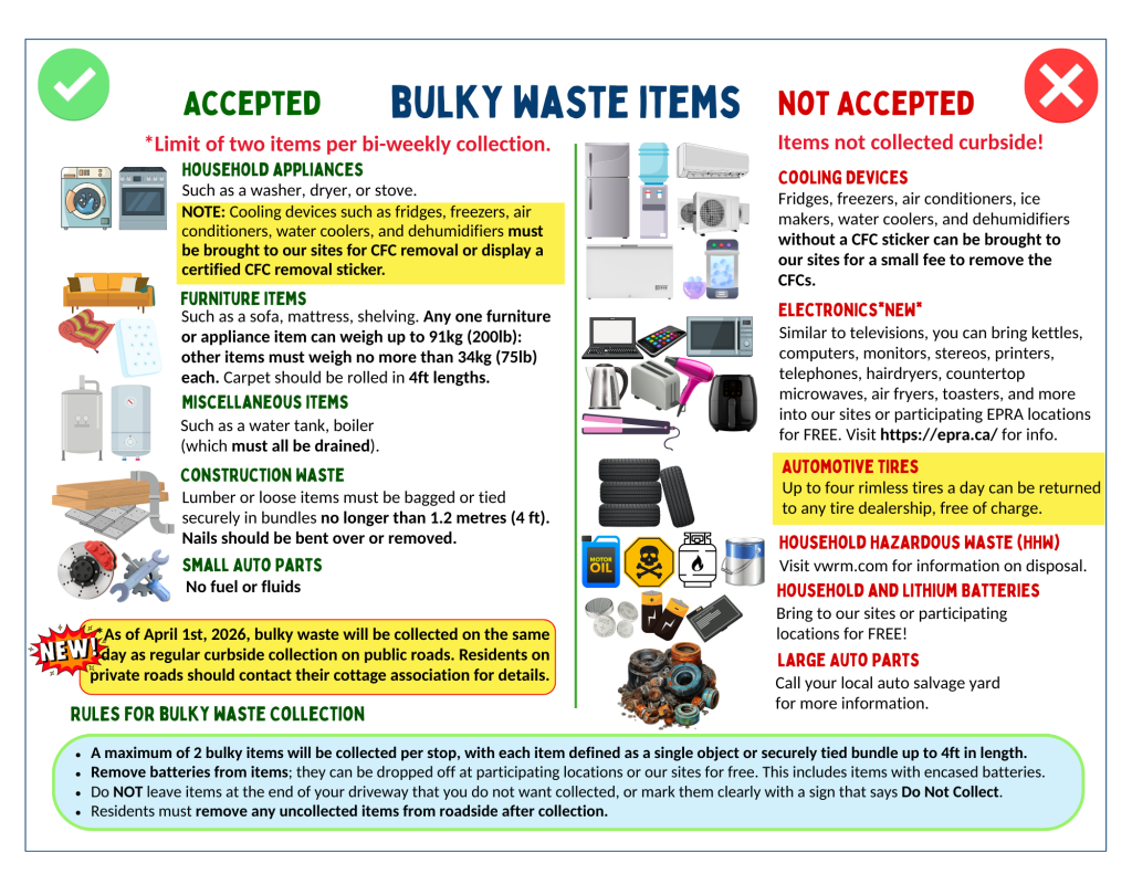 - Items restricted by local regulations or stewardship programs i.e. electronics, tires, paint, oil, household hazardous waste, bulbs