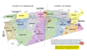 The Waste Collection map has been compiled based on the most recent information available, however, errors or omissions may occur. To confirm collection days or for further information on waste disposal, sorting and collection within the Municipality, contact Valley Waste Resource Management at info@vwrm.com or call the Hotline on 1-877-927-8300 (902-679-1325).