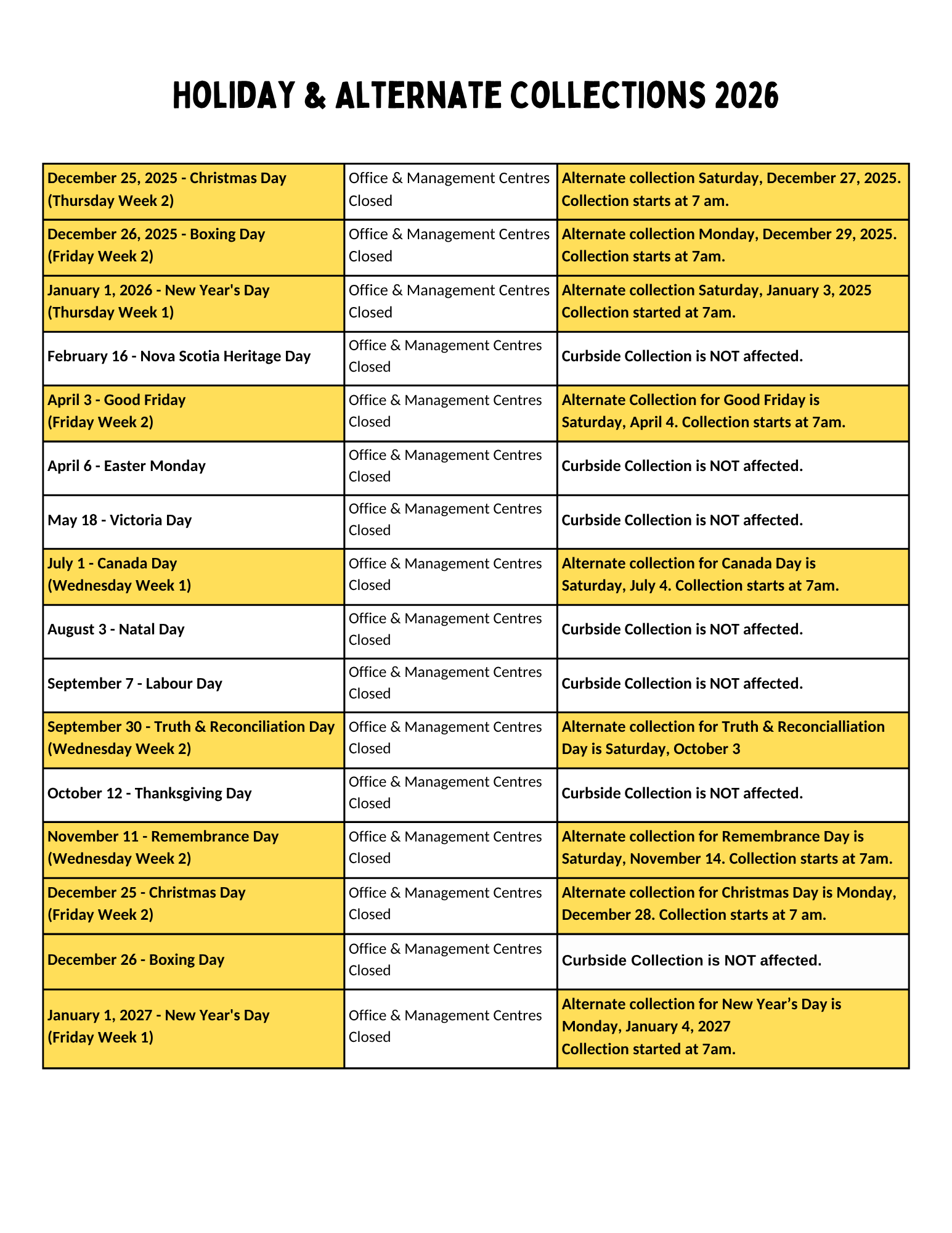 Please check our Holiday Collection Schedule for 2026 to see when our sites and office are closed and if an alternate collection is applicable.