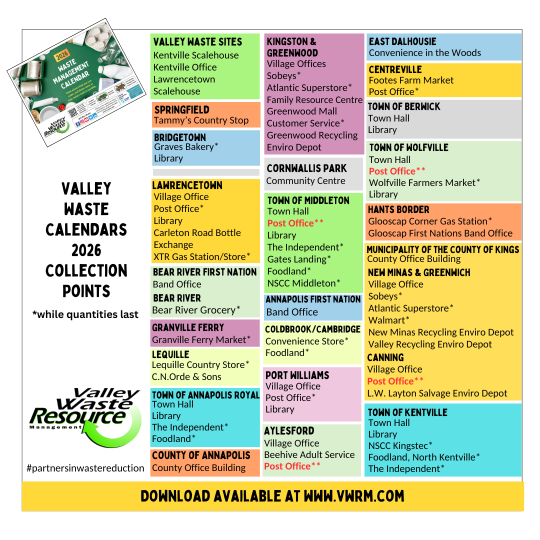 2026 Calendars are available for collection at various locations listed including the Municipal offices, Town Halls, and Village offices, libraries, and Valley Waste sites and office while quantities last. You can also download our Valley Waste Calendar for 2026.